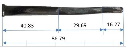 圖11 螺紋孔形狀、尺寸及缺陷位置 原因在于,型芯針孔大端尺寸要求φ8±0.3 mm,實(shí)測結(jié)果為7.98 mm,尺寸合格;型芯針孔深度要求:87±1 mm,實(shí)測結(jié)果為86.79 mm,尺寸合格。但是型芯針在距離頂部40.83 mm處,開始發(fā)生彎曲;長度29.69 mm處,型芯針表面有輕微拉傷,表面涂層有脫落;長度16.27 mm處,嚴(yán)重粘鋁,見圖12。