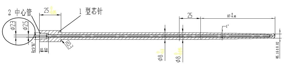 圖12 型芯針彎曲位置 高壓點(diǎn)冷型芯針冷卻不足,表面溫度過高,金屬液易粘模,導(dǎo)致嚴(yán)重粘鋁,脫模困難,損壞型芯針;型芯針熱硬度和熱穩(wěn)定性不足,抗熱疲勞及突變失效的能力差,兩個因素疊加導(dǎo)致型芯針易發(fā)生彎曲變形。 針對產(chǎn)品高壓點(diǎn)冷型芯針彎曲,工藝改進(jìn)措施如下:①高壓點(diǎn)冷型芯針原設(shè)計,內(nèi)孔直徑為2.5 mm,中心管直徑為2.3 mm,單邊間隙只有0.1 mm,排水量小,容易堵塞,影響冷卻效果,見圖13;設(shè)計改進(jìn)后,內(nèi)孔直徑為3 mm,中心管直徑為2 mm,單邊間隙為0.5 mm,排水暢通,可以有效保證冷卻效果。改善措施實(shí)施后,針表面沒有粘鋁、拉傷缺陷,表面質(zhì)量良好。