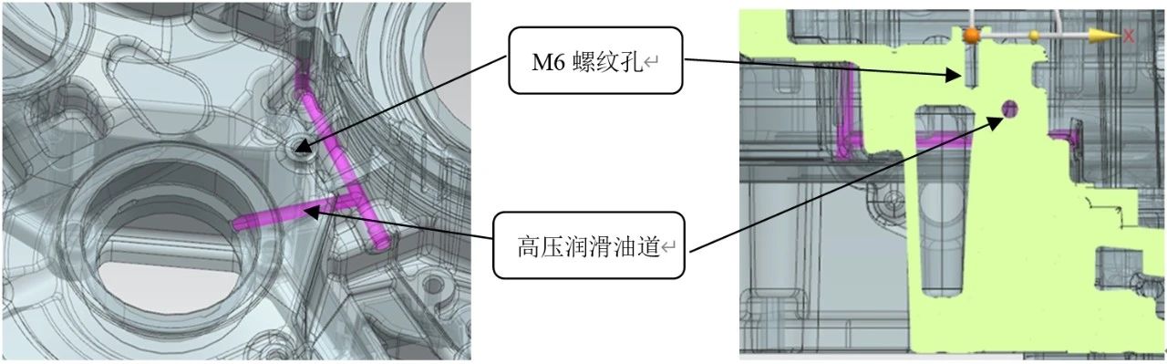 圖13 高壓點(diǎn)冷型芯針 ②由于該型芯針直徑小且比較長,容易彎曲變形,導(dǎo)致壽命只有200件,嚴(yán)重影響生產(chǎn)連續(xù)性,需要對針的材料和壽命進(jìn)行改善。材料由SKD61改為W360合金,硬度(HRC)為52~56,同時表面進(jìn)行滲氰處理,提高型芯針表面硬度和耐磨性。實(shí)施改善措施后,針沒有發(fā)生彎曲,只是在接近壽命時會發(fā)生斷裂,根據(jù)數(shù)據(jù)統(tǒng)計,壽命按9000件進(jìn)行管理,可以保證連續(xù)穩(wěn)定生產(chǎn)。 (3)問題3:產(chǎn)品軸承孔旁的M6螺紋孔,深度為21 mm,加工完成后,在300 kPa壓力下和高壓潤滑油道發(fā)生串漏,發(fā)生比例為35%,嚴(yán)重影響產(chǎn)品的密封及使用功能。漏氣位置見圖14。