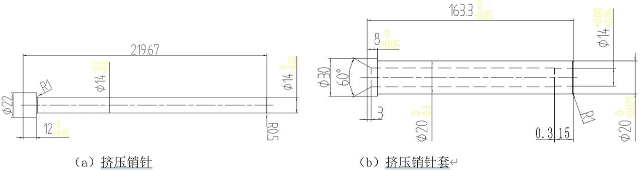 圖15 改進(jìn)前擠壓銷設(shè)計 通過修改毛坯設(shè)計,凸臺直徑由原來φ14 mm增加至φ22 mm,擠壓銷針改為φ14 mm,擠壓銷針套為φ20 mm,擠壓行程為15 mm,見圖16。措施實(shí)施后,產(chǎn)品內(nèi)部質(zhì)量良好,沒有發(fā)生泄漏。