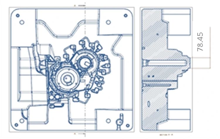 圖3 動模設(shè)計 1.3 嵌件工藝設(shè)計 為了提高變速箱輸出帶輪軸前軸承孔的耐磨性能,產(chǎn)品設(shè)計了嵌件結(jié)構(gòu),嵌件材料為ADC14合金,壁厚為3 mm,見圖4。要求嵌件在模具上放置位置準(zhǔn)確、穩(wěn)定可靠,壓鑄過程中,鋁液和嵌件緊密結(jié)合無間隙,且該孔用作機(jī)加工定位孔。嵌件內(nèi)徑φ78.57±0.03 mm,動模定位凸臺直徑φ78.45±0.01 mm,配合間隙單邊0.04~0.08 mm,嵌件使用烤箱加熱至200 ℃,人工拿取與模具前端貼合放置。嵌件在模具上定位見圖5。