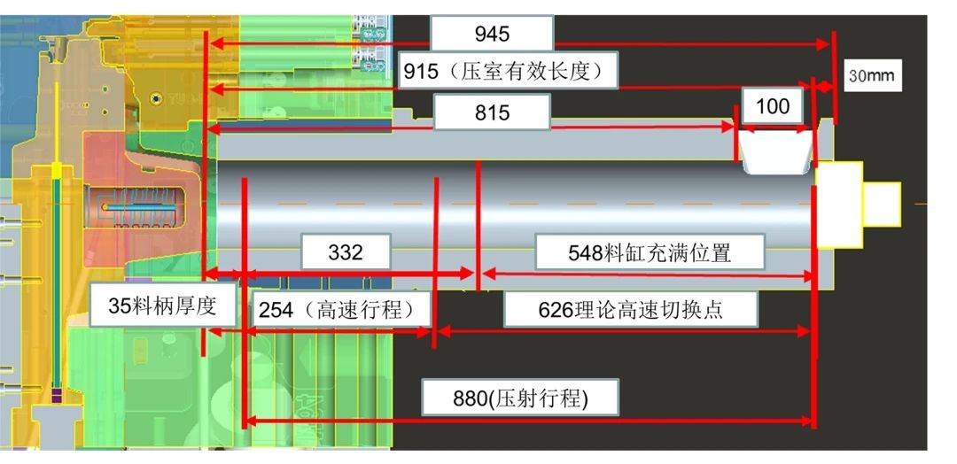 圖5 動模嵌件定位 1.4 壓鑄工藝參數(shù)設(shè)計 鑄造壓力選擇75 MPa, 填充速度為50 m/s;內(nèi)澆口總橫截面積為1 490 m㎡;沖頭直徑為160 mm, 沖頭橫截面積=πD2/4=20 096 m㎡;內(nèi)澆口和沖頭速度比= 沖頭橫截面積/內(nèi)澆口總橫截面積=13.49;沖頭速度=內(nèi)澆口速度/內(nèi)澆口和沖頭速度比=3.7m/s;G內(nèi)澆口通過質(zhì)量=G產(chǎn)品質(zhì)量+G渣包重量=13 500 g;填充時間=內(nèi)澆口通過質(zhì)量/(鋁液密度×內(nèi)澆口截面積×填充速度)=68 s; 高速切換位置,一般以溶湯到達(dá)澆口的位置為基準(zhǔn)進(jìn)行設(shè)定,根據(jù)產(chǎn)品質(zhì)量和功能需求,前后調(diào)整切換位置來選擇最佳位置,對產(chǎn)品質(zhì)量影響較大,產(chǎn)品某位置出現(xiàn)缺陷時,都可以通過調(diào)整切換位置來觀察缺陷的變化來改善產(chǎn)品,見圖6,計算方法如下: 高速行程= G內(nèi)澆口通過質(zhì)量/沖頭橫截面積/AI液密度=(13500/20096)/2.64×1000=254 mm; 料柄厚度為35mm; 高速切換點(diǎn)=壓室有效長度-料柄厚度-高速行程=915-35-254=626mm;