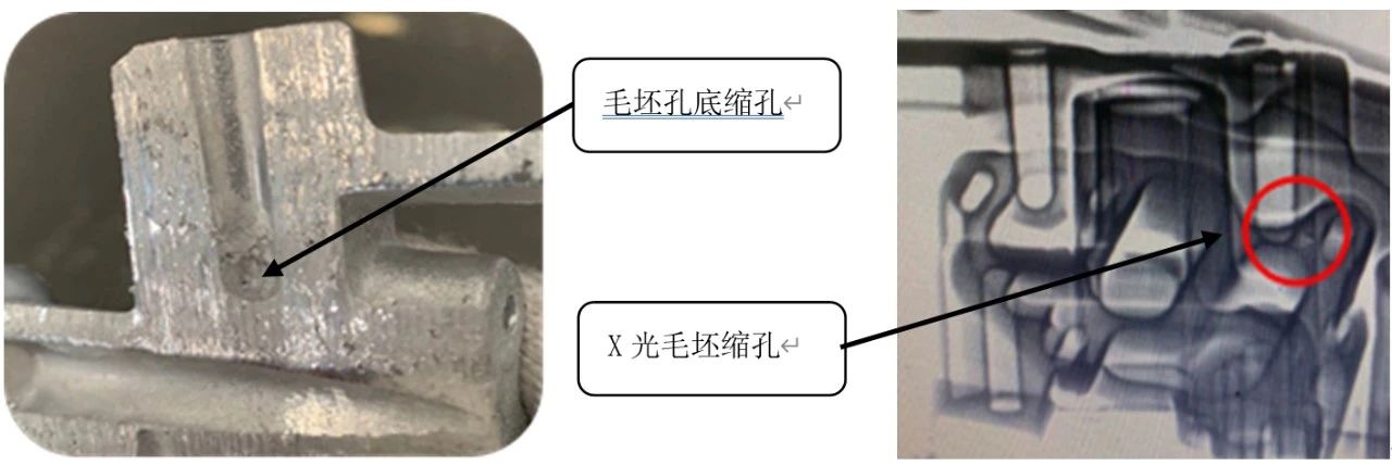 圖7 漏氣位置 原因是,M10螺紋孔位置局部厚大,達(dá)到20 mm,屬于熱節(jié),在壓鑄成形過程中,產(chǎn)生約5 mm大小的縮孔,導(dǎo)致M10螺紋孔和高壓油道串漏,缺陷解剖及X光檢查,見圖8。