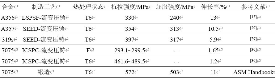 圖3 微觀組織長大過程模擬仿真結果與真實凝固組織對照 2、高性能鋁合金材料 目前,高固相流變壓鑄成形實現工業化應用的鋁合金材料以亞共晶Al-Si系合金為主,常用材料包括356、357、319s鋁合金。部分高固相流變壓鑄成形鋁合金的力學性能見表2。可以看出,流變壓鑄成形鋁合金的力學性能與鍛造成形7075鋁合金還有一定的差距。為了滿足更多應用場景的具體應用需求,國內外開展了流變壓鑄成形用高性能鋁合金材料的研發。