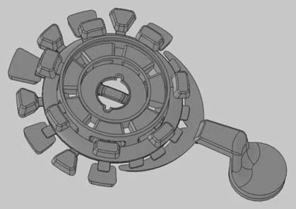 圖10 3.8JB分火器 在設定條件不變的前提下,當快壓射實際速度達2m/s以上時,加工面即出現氣孔和微斑點。 3.3?模具分型面維穩 368B型分火器如圖11所示,此件有7個抽芯的壓鑄件,要求表面大面積鏡面加工后不準有氣孔、微斑點、流痕、色差等,這個件在壓鑄生產過程中,如果分型面出現披縫,壓鑄件加工面就會出現氣孔,并已被多次驗證。因此,保持分型面完好,壓鑄件無披縫,保持內澆道尺寸在既定的范圍,就是這套模具維護保養工作的重點。