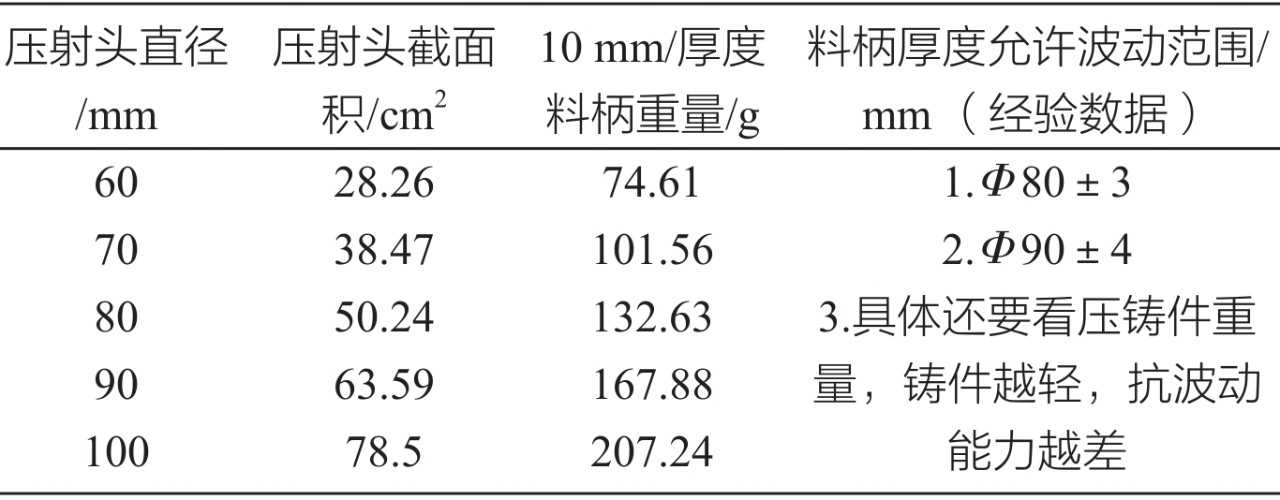 圖1 魚刺圖 2.1.1 人因素 人是壓鑄現場的主導,是所有因素之首。包括安全生產,圍繞生產活動的一切工作是由人決策的。產品品質總是會波動的,運用管理工具分析并解決問題,把各環節波動值控制在最小范圍,減少不良品率,這一切仍然靠人。 2.1.2 機器因素 機指的是工作母機,模具以及與之相配套的輔助設備裝置。由于模具在壓鑄工藝上的重要性,將在下文單獨作為一個因素分析。機器裝備的能力是生產制造能力的決定因素,因此越高端的設備對于維護保養的要求也越高。 在生產安排過程中,針對不同產品,選用適合于它的機器設備。做好日常點檢,做到有問題能及時發現,及時修復。做好定期保養或擇機保養,確保設備完好和性能穩定。嚴禁拆東補西,保持設備完整。壓鑄生產現場容易忽視的問題點:①壓射桿連接部分配合不良對壓鑄件品質的影響;②加料機給料不穩定對壓鑄件品質的影響。如表1所示(鋁液密度2.64g/cm³)。