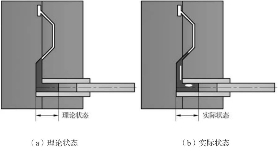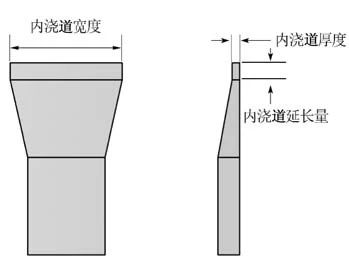 圖4 澆注量偏少時的不正常狀態 噴霧機噴霧量與霧化效果不穩定也能對壓鑄件質量產生影響。壓縮空氣壓力的較大波動,正常的氣壓應控制在5.5~6.5 kg/c㎡,這一點非常重要;空氣壓力的較大波動造成脫模劑壓送壓力也隨之大幅波動。氣壓和水壓的較大波動造成脫模劑噴出量和霧化效果隨著氣壓的變化而變化,模具溫度和脫模潤滑效果也隨之跟著變化,產品品質也隨之波動。我國南方大部分地區夏天空氣濕度較大,壓縮空氣中會產生大量的乳化水,這些乳化水隨著空氣流動噴到模具型腔上,會使壓鑄件內部氣孔和冷隔增多,還會使壓鑄件表面出現斑點等不良現象,這是被很多人忽略的不良因素。所以儲氣罐底部和主管道最低點處要加裝自動排水閥,定期自動排水,盡量減少壓縮空氣中的水分。 2.1.3 模具因素 在設備已滿足現場條件的前提下,壓鑄模具狀況對壓鑄件品質的影響占主要因素。壓鑄生產過程中,現場人員用在模具上的時間精力往往是最多的,因此模具的日常維護保養工作很重要,主要需要注意以下幾點。 (1)確保分型面完好。分型面配合不好容易出現氣邊或飛料,飛料會造成型腔失壓和無料補縮,使壓鑄件內部出現較大氣孔和大面積疏松。為了品質和安全必須嚴控。 (2)內澆道尺寸和形狀的保持。壓鑄生產現場,內澆道厚度、寬度和內澆道延長量的管控非常重要。生產過程中隨著內澆道不斷被沖蝕,內澆道寬度、厚度不斷增大,內澆道延長量越來越短,壓鑄件的內部不良率會越來越高。 以上現象稱為澆道沖蝕,是壓鑄生產過程中必然會出現的現象。澆道沖蝕所帶來的不良后果是普遍的,也是往往被忽略的。因沖蝕加大了內澆道的寬度和厚度尺寸使內澆道截面積增大,造成的工藝參數變化后果如下:①充填阻力減小,內澆道流速隨之改變,也改變了充填時間;②充填時間縮短,加大了型腔內氣體的壓力,加大了排氣阻力;③排氣速度隨之改變,部分氣體來不及排出殘留在壓鑄件內部;④來不及排出的氣體殘留在壓鑄件內部形成氣孔,而且分布狀況從有規律逐步演變成無規律,繼續沖蝕下去鑄件內部冷隔也逐步出現。 因此,將內澆道寬度、厚度和內澆道延長量尺寸變化控制在合理的范圍內是必需要做的工作。根據經驗數據判斷,內澆道延長量應為內澆道厚的尺寸的1~2倍。它的主要作用是:在高速充填時將慢速充填過程中夾流道鋁液中的氣體搓碎,避免在鑄件內形成較大氣孔,對于減少冷隔也有一定幫助,如圖5所示。