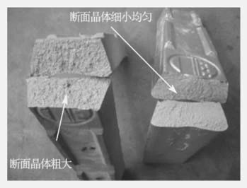 圖5 內澆道尺寸與內澆道延長量 (3)冷卻水路保持清潔暢通且水壓穩定。模溫控制是穩定壓鑄件品質的有效手段。在沒有模溫機配合的情況下,模具冷卻系統的完好有效也是壓鑄生產過程中必需管控的一個環節。 冷卻效果不好,模溫偏高(超過250 ℃),會因蒸氣反彈造成脫模劑難以有效附著,使壓鑄件內部出現縮孔,表面局部粘鋁等,還會影響生產效率。冷卻過度會使模溫偏低(低于180 ℃),會造成脫模劑不能有效附著,影響脫模效果,水分也不能正常蒸發,會造成壓鑄件內部氣孔、冷隔、局部冷料堆積等不良現象。 壓鑄生產現場容易忽視的幾個問題點。 (1)澆口套和熔杯配合不良對壓鑄件品質的影響。 (2)排氣塊排氣槽堵塞對壓鑄件品質的影響。生產現場,特別是老模具經常會出現這樣的情況:分型面上多處可排氣,唯獨排氣槽和排氣塊是堵塞的,不能正常排氣。這種現象往往被忽略,但實際上它改變了排氣順序。充填順序和排氣順序應該是相向而行的,切不可相對而行。這也就是誤認為模具排氣效果很好,但壓鑄件孔穴率總是較高的因素之一。 (3)冷卻水滴漏對壓鑄件品質的影響。冷卻水滴漏是壓鑄現場常見的問題,看是小事,實際上卻隱藏大隱患:①漏到型腔內和熔杯內的水不僅僅是造成局部溫度下降的問題,當水遇到鋁液后會迅速氣化產生大量氫氣,并被鋁液吸收后填入型腔,這也是壓鑄件孔穴率較高的因素之一;②從點冷孔、集中分配器等地方漏到模架上的水同樣不可小視,漏水量較大時它會拉低模架溫度使模芯溫度難以保持,還會從各配合間隙處進入型腔,這同樣是壓鑄件孔穴率較高的因素之一。 (4)油缸漏油對壓鑄件品質的影響。油缸漏油不僅會產生和漏水同樣的氣孔問題,還會造成較大的油料消耗,直接增加生產成本,還會留下安全、環保等隱患。 2.1.4 料因素 料主要是指原材料和輔助材料。原材料影響壓鑄件品質的(主要指氣孔)主要有以下幾個因素。 (1)鋁錠的內部致密度,根據經驗判斷鋁錠斷口整齊,斷面晶體細小均勻的可判定為好材料,而斷口面晶體粗大的則容易造成壓鑄內部氣孔,如圖6所示。左邊鋁錠斷面晶體粗大,右邊零件斷面晶體細小均勻。