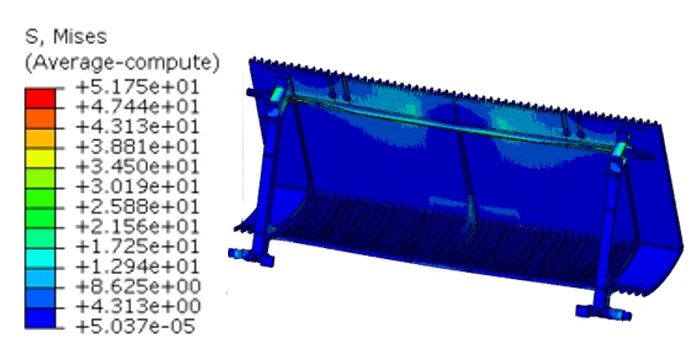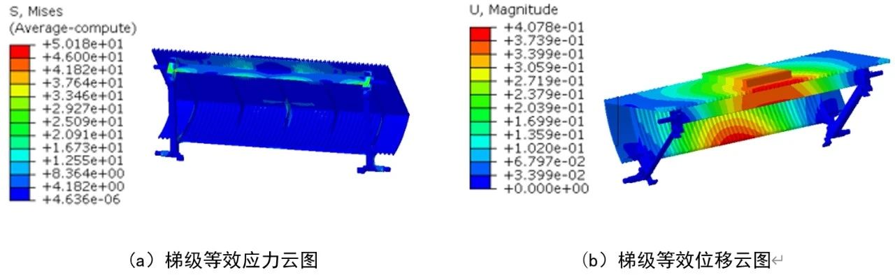 圖4 梯級結構1靜力學分析 (2)結構2:梯級的等效應力見圖5a,最大應力為50.18 MPa,發生在兩邊主動輪軸軸套附近。梯級的等效位移見圖5b,最大位移為0.41 mm,發生在踏面邊緣的中間位置。