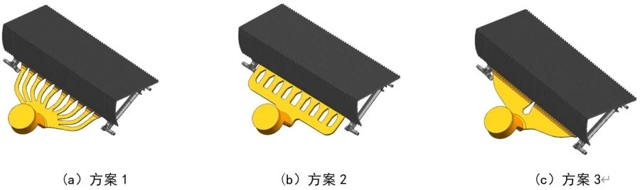 采用30 000 kN壓鑄機,壓射沖頭直徑選為Ø180mm,高速壓射階段,壓射沖頭的速度選為4 m/s,根據式(2),驗算充填速度: 通過計算,充填速度為46 m/s,小于60 m/s,充填速度合理,也說明內澆口截面積合理。 (3)3種不同的澆注系統設計 根據內澆口截面積,結合梯級的結構特征,設計3種不同的澆注系統進行分析比較,見圖11。①方案1:梯級屬于結構件中大范圍平板類型零件,此類產品通常采取平鋪進料的方案。澆口布置采用均勻分布的梳形澆口的形式,進澆位置選擇在踢板側,設計10支分流道,便于澆注系統與梯級形成斷口,減少澆注系統對產品變形的影響,見圖11a。②方案2:根據梯級的壁厚和結構特征,澆注系統采用梳形結構,開設10支分流道,內澆口厚度為3 mm,寬度為730 mm,長度為1.5 mm。料餅厚度50 mm,便于產品補縮,見圖11b。③方案3:澆注系統采用長錐形切線流道,澆口沿分型面開設,在澆口寬度方向,填充范圍寬,鋁液填充流動較均勻。內澆口厚度為2.8 mm,寬度為780 mm,長度為1.5 mm,見圖11c。