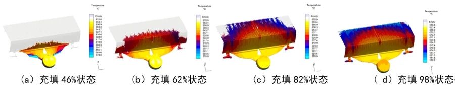 圖12 方案1充填過程分析 方案2:從圖13可以看出,充填達46%時,鋁液在中間分流道充填速度快,兩邊分流道充填速度慢。充填達62%時,流道內有卷氣,鑄件內部卷氣嚴重,料溫較低。充填達82%時,在產品轉角部位出現明顯裹氣,此處存在卷氣風險。充填達98%時,鑄件末端部位出現低于液相線的冷料,此處冷隔風險較高。