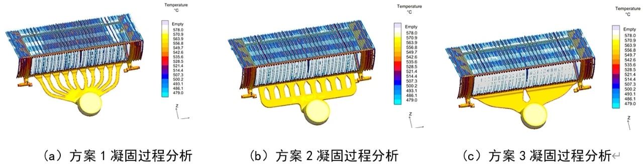 圖14 方案3充填過程分析 (2) 凝固過程分析 對3種澆注系統設計方案的凝固過程進行分析,見圖15。可以看出,3種澆注系統的凝固過程基本相似。凝固溫度分析顯示,兩側初始溫度較低,凝固速度最快。踏面和踢面依次凝固,澆注系統最后凝固,起到補縮作用。梯級鑄件具有薄壁的特點,凝固順序對鑄件質量影響不大。