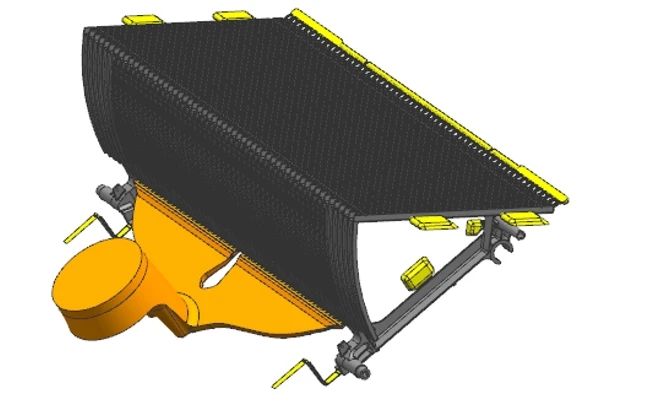 圖1 整體式壓鑄鋁合金梯級部件結構圖 1、梯級結構優化 整體式壓鑄梯級的主要特點是體積大、長度長,國內自動扶梯一般采用600、800、1 000 mm,一般雙梯的梯級長度常用1 000 mm。梯級鑄件一般質量在13 kg左右,有的甚至達15 kg,鑄件一般壁厚在3 mm左右。梯級要求安全、自重輕、剛度好,彈性變形小,耐腐蝕性強,裝拆維護方便,制造成本及能耗低。 1.1 梯級材料特性 1000型梯級材料選用鋁合金A380,其化學成分和力學性能要求見表1。該鋁合金具有較高的強韌性能、良好的切削性和鑄造性,其屈服強度為160 MPa,彈性模量為72 GPa,泊松比υ為0.3,密度為2.7 g/cm³。
