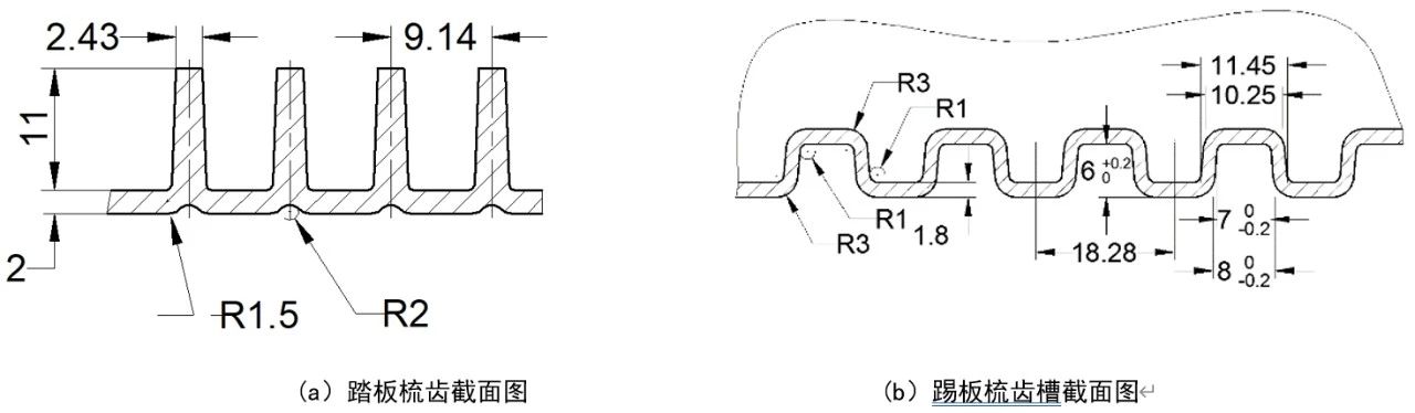 圖2 3種不同的梯級結構設計 梯級踏板(結構3)的梳齒結構見圖3, 踏板的壁厚為2 mm,梳齒高度為11 mm,單個梳齒小端厚度為2.43 mm,踏板上共有111個梳齒,相鄰2個梳齒之間的中心距為9.14mm。踢板梳齒槽結構見圖3b,梳齒槽壁厚為1.8 mm,梳齒槽深度為6 mm,相鄰2個梳齒槽之間的中心距為18.28 mm。