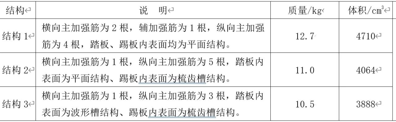表1 A380化學成分及力學性能 1.2 梯級結構設計 在梯級結構設計中,既要考慮安全、技術要求符合國家標準,同時也要考慮整體式梯級的輕量化以及壓鑄工藝。梯級最大外形尺寸(長×寬×高)為1 009 mm×411 mm×340 mm,對3種不同的梯級結構設計進行分析比較,見圖2。 結構1:梯級壁厚為1.8 mm,橫向有2根主加強筋,筋板厚度為3.5 mm,高度為45 mm,長度為810 mm。同時為加強踏板的剛度,在踏板中間設計了一根小的加強筋。縱向有4根主加強筋,筋板厚度為2 mm,見圖2a。 結構2:梯級壁厚為1.8 mm,橫向有1根主加強筋,筋板厚度為3 mm,高度為65 mm,長度為810 mm。縱向有5根主加強筋,筋板厚度為2.5 mm,見圖2b。 結構3:梯級壁厚為1.8 mm,壁厚均勻,橫向筋板最小端壁厚為3 mm,高度為85 mm,長度為810 mm。縱向有3根主加強筋,筋板厚度2mm,見圖2c。