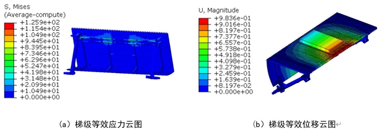 表2 3種不同的整體式梯級結構設計對比分析 1.3 梯級靜力學分析 根據GB 16899-2011,梯級應進行抗彎變形試驗,梯級踏板中央放置一塊鋼板,鋼板尺寸為0.2 m×0.3 m,厚度為28 mm,并使其0.2 m的一邊與梯級前緣平行,0.3 m的一邊與梯級前緣垂直,乘客載荷為3 000 N,垂直作用在鋼板上,梯級踏板的變形量不應大于4 mm,且應無永久變形。 采用ABAQUS有限元分析軟件對3種不同結構的梯級進行靜力學分析。根據梯級的實際工況,將主輪位置所在的軸套內表面施加固定約束,鋼板置于梯級中間,施加3 000 N載荷,靜力學分析見圖4~圖6。 (1)結構1:梯級的等效應力見圖4a,最大應力為125.90 MPa,發生在兩邊斜支架與踏面筋板交匯附近,小于梯級屈服強度160 MPa。梯級的等效位移見圖4b,最大位移為0.98 mm,發生在踏面邊緣的中間位置,小于國家標準要求的4 mm變形量以內。