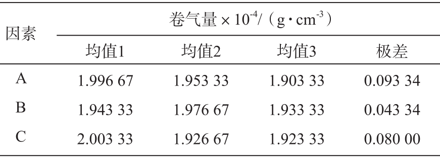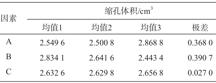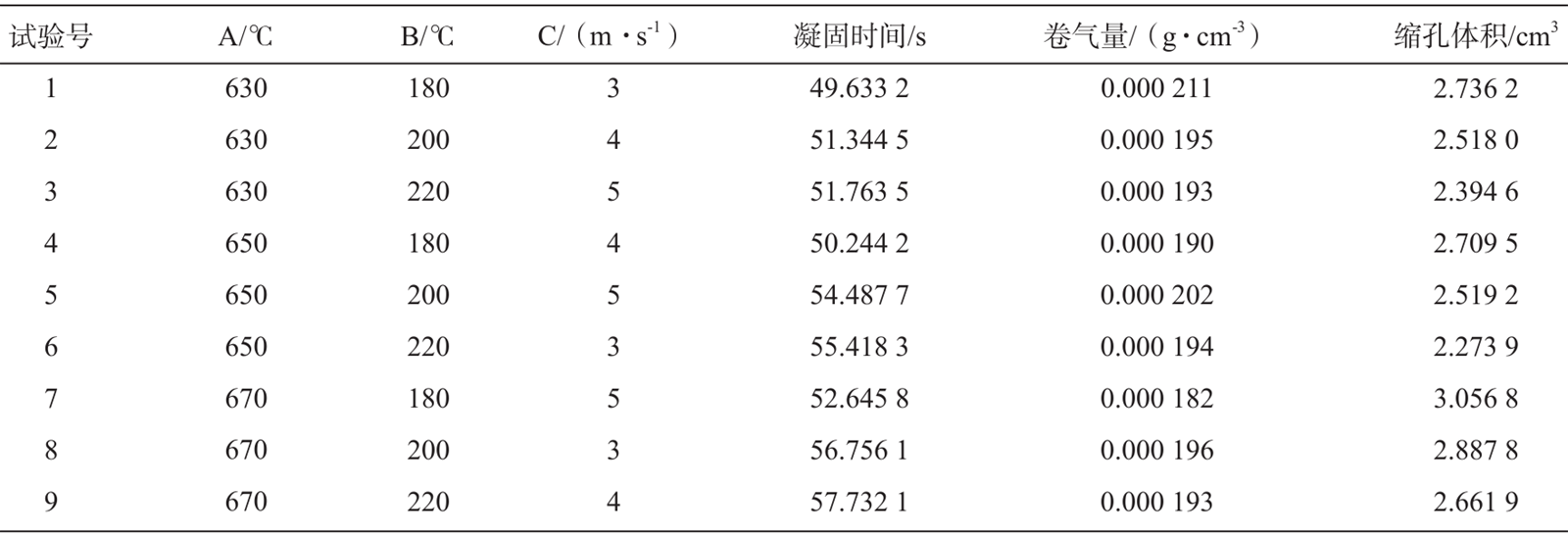 表2 正交試驗因素水平表 正交試驗設(shè)計為三因素三水平,根據(jù)正交表的使用規(guī)則,選用L9(3³)正交表,共進行9組正交試驗。依次對各組試驗方案進行數(shù)值模擬分析,將模擬結(jié)果中的凝固時間、縮孔體積、卷氣量三種質(zhì)量指標作為試驗結(jié)果,得到各組試驗結(jié)果如表3所示。