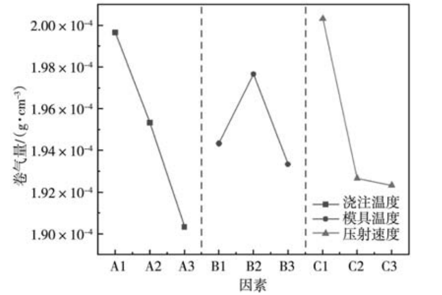 圖8 壓鑄工藝參數(shù)對凝固時間均值的主效應(yīng)圖 為確定3個因素對鑄件內(nèi)部卷氣量影響的主次順序和變化規(guī)律,對模擬結(jié)果進行極差分析。表5所示為卷氣量極差分析表,圖9所示為壓鑄工藝參數(shù)對卷氣量均值的主效應(yīng)圖。根據(jù)表5可知,壓鑄工藝參數(shù)對于卷氣量的影響程度大小為:澆注溫度(A)>壓射速度(C)>模具溫度(B)。對于卷氣量而言,澆注溫度與壓射速度對其影響較為顯著,而模具溫度對其作用有限,這與合理的澆注溫度與壓射速度能夠提供良好的金屬液流動性有關(guān)。在一定范圍內(nèi),金屬液澆注溫度越高,壓射速度越快,其流動性越好。由圖9可知,當澆注溫度選擇A3,模具溫度選擇B3,當壓射速度選擇C3,使得鑄件的卷氣量達到最小。因此在將卷氣量作為鑄件質(zhì)量的單一評定標準時,鑄件的最佳壓鑄工藝參數(shù)為A3B3C3。