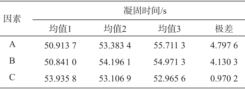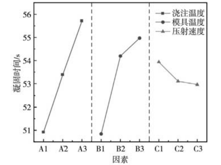 表3 正交試驗方案 3.2 正交試驗結(jié)果分析 為確定3個因素對凝固時間影響的主次順序和變化規(guī)律,對模擬結(jié)果進行極差分析,表4為凝固時間極差分析表,圖8所示為壓鑄工藝參數(shù)對凝固時間均值的主效應(yīng)圖。根據(jù)表4可知,壓鑄工藝參數(shù)對凝固時間的影響程度大小為:澆注溫度(A)>模具溫度(B)>壓射速度(C)。對于凝固時間而言,澆注溫度和模具溫度對其影響顯著,而壓射速度對其作用有限,這是因為溫度參數(shù)過高,導致金屬液到達固相線的時間變長,而壓射速度對金屬液的溫度變化影響較小。因此在合理的工藝參數(shù)范圍內(nèi),溫度參數(shù)可選擇較低水平,以提高壓鑄生產(chǎn)效率。由圖8可知,當澆注溫度選擇A1,模具溫度選擇B1,壓射速度選擇C3,使得鑄件的凝固時間達到最短。因此在將凝固時間作為鑄件質(zhì)量的單一評定標準時,鑄件的最佳壓鑄工藝參數(shù)為A1B1C3。