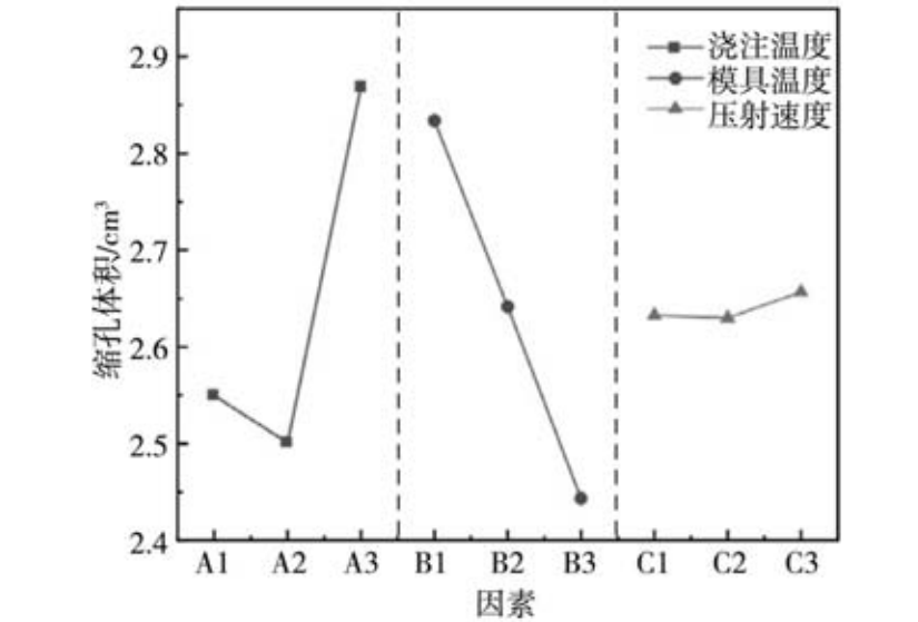 圖9 壓鑄工藝參數(shù)對卷氣量均值的主效應(yīng)圖 為確定3個因素對鑄件內(nèi)部縮孔體積影響的主次順序和變化規(guī)律,對模擬結(jié)果進行極差分析,表6所示為縮孔體積極差分析表。圖10所示為壓鑄工藝參數(shù)對縮孔體積均值的主效應(yīng)圖。根據(jù)表6可知,壓鑄工藝參數(shù)對于縮孔體積的影響程度大小為:模具溫度(B)>澆注溫度(A)>壓射速度(C)。澆注溫度和模具溫度對縮孔率的影響非常顯著,而壓射速度對縮孔率的影響有限,這是因為鑄件內(nèi)部的縮孔缺陷是由于凝固過程金屬液補縮不及時導致,而良好的溫度參數(shù)可以改善鑄件凝固過程,而壓射速度對改善鑄件凝固過程的作用較小。由圖10可知,當澆注溫度選擇A2,模具溫度選擇B3,當壓射速度選擇C2,使得鑄件的縮孔體積達到最小。因此在將縮孔體積作為鑄件質(zhì)量的單一評定標準時,鑄件的最佳壓鑄工藝參數(shù)為A2B3C2。 結(jié)合以上分析可得,當凝固時間作為評價指標時,最佳工藝參數(shù)為澆注溫度630 ℃、模具溫度180 ℃、壓射速度5 m/s;當卷氣量作為評價指標時,最佳工藝參數(shù)為澆注溫度670 ℃、模具溫度220 ℃、壓射速度5 m/s;當縮孔體積作為評價指標時,最佳工藝參數(shù)為澆注溫度650 ℃、模具溫度220 ℃、壓射速度4 m/s。根據(jù)實際生產(chǎn)工藝的選取原則,需在保證產(chǎn)品質(zhì)量的前提下,提高生產(chǎn)效率,故正交試驗中質(zhì)量指標的重要性順序為:縮孔體積、卷氣量、凝固時間,經(jīng)過綜合分析最終確定差速器殼體的最佳壓鑄工藝參數(shù)為澆注溫度650 ℃、模具溫度220 ℃、壓射速度5 m/s。