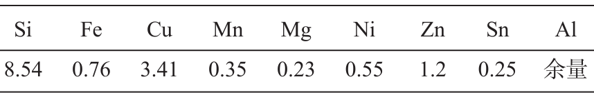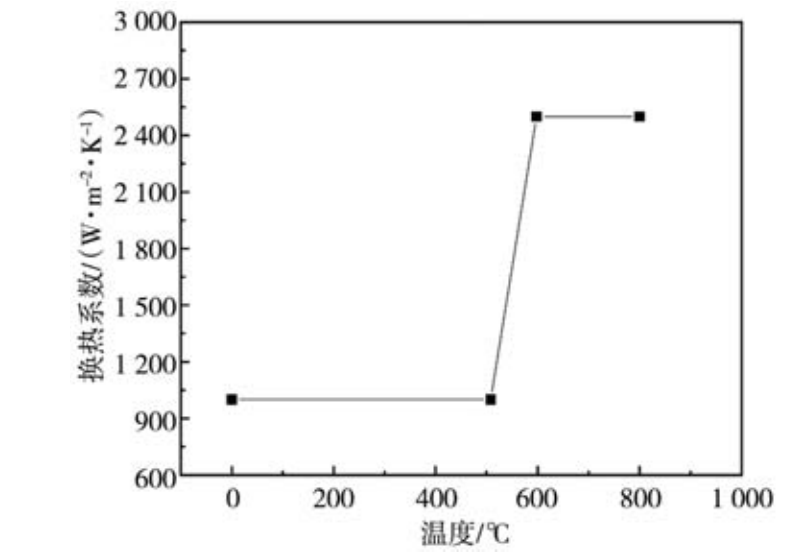 圖1 高壓壓鑄有限元模型 差速器殼體材料選用A380鋁合金,化學成分如表1所示。A380鋁合金的熱物性參數(shù)由軟件提供,其中固相線溫度為508 ℃,液相線溫度為589 ℃。模具材料選用H13合金鋼,在壓鑄數(shù)值模擬過程中,壓鑄模僅起到熱交換的作用,并不參與流場計算。壓鑄過程中涉及多種熱傳遞現(xiàn)象,主要包括鑄件與模具、模具與模具的熱傳導,空氣與模具外表面的熱對流。設(shè)置模具與模具的傳熱系數(shù)為1 000 W/(㎡·K),模具與空氣的傳熱系數(shù)為10 W/(㎡·K),鑄件與模具的傳熱系數(shù)采用曲線形式的換熱系數(shù)(圖2)。高壓壓鑄初始工藝參數(shù):澆注溫度660 ℃、模具溫度220 ℃、壓射速度4 m/s。