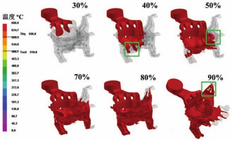 圖2 A380-H13的換熱系數(shù) 2、模擬結(jié)果與分析 2.1 鑄件充型過程分析 鑄件充型過程如圖3所示。從圖中可以看出,當充型率為30%時,中部澆道內(nèi)的金屬液通過內(nèi)澆道開始充填型腔,而兩側(cè)澆道距離沖頭較遠,金屬液尚未到達內(nèi)澆道。當充填率為50%時,由于中部澆道內(nèi)的金屬液充型較快,在到達遠澆道后與右側(cè)澆道內(nèi)的金屬液在型腔右端圓筒區(qū)域發(fā)生回流現(xiàn)象,因此右端圓筒區(qū)域可能出現(xiàn)較多缺陷。當充型率為70%時,中部澆道的金屬液完成對型腔中部的充型,兩側(cè)澆道的金屬液充填至兩側(cè)支架。當充型率完成80%至90%時,右側(cè)上端支架充型較為紊亂,該處為金屬液在型腔中最后達到的地方,需要較長的填充距離,此時的金屬液損失了較多的熱量導致其流動性降低。同時由于鑄件壁厚處存在局部區(qū)域未及時填充的情況,金屬液到達型腔末端后發(fā)生回流,并在壁厚處發(fā)生卷氣,而回流和卷氣會導致在鑄件凝固后期形成氣孔缺陷。