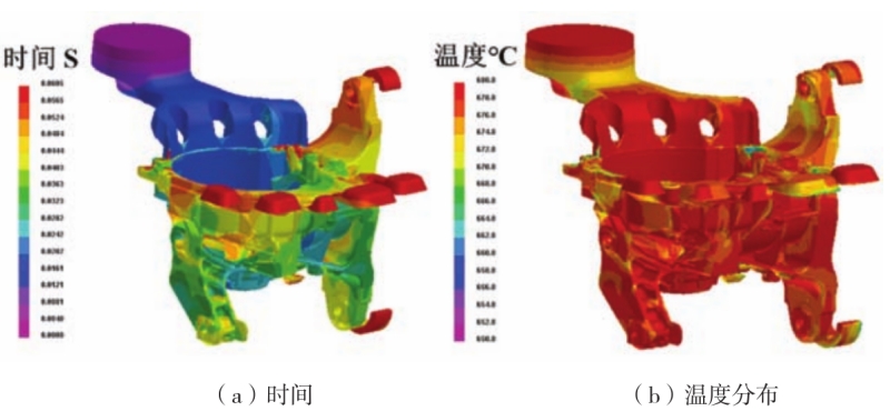 圖3 金屬液充型過程 金屬液充填時間和溫度分布如圖4所示。根據(jù)圖4a充型過程時間分布可將差速器殼體充填過程從先往后順序依次劃分成藍色、綠色、黃色和紅色四個部分。藍色區(qū)域主要包括澆道以及鑄件近澆道處;綠色區(qū)域主要包括兩側(cè)支架的底部;黃色區(qū)域主要包括鑄件的平臺處以及距離內(nèi)澆道較遠的右側(cè)上端支架;紅色區(qū)域大部分位于鑄件的溢流槽中,小部分位于金屬液在到達型腔末端后在壁厚處發(fā)生回流的區(qū)域。整體而言,差速器殼體充填順序主要遵循由近及遠的規(guī)律,但鑄件右側(cè)上端支架充填較晚,導致該處充型質(zhì)量較差。圖4b為鑄件充型過程溫度分布。在充型過程中,型腔中的金屬液始終保持較高的溫度,其中鑄件底部圓筒處以及兩側(cè)支架處為型腔溫度最低區(qū)域,溫度約為625 ℃。充型末期,型腔內(nèi)的金屬液溫度均在A380液相線(598 ℃)以上,沒有發(fā)生提前凝固的現(xiàn)象。在整個充型過程中,型腔內(nèi)金屬液溫度較高,遠澆道處的金屬液溫度較近澆道處略有降低,但溫度梯度小,整體分布合理,金屬液流動性良好。