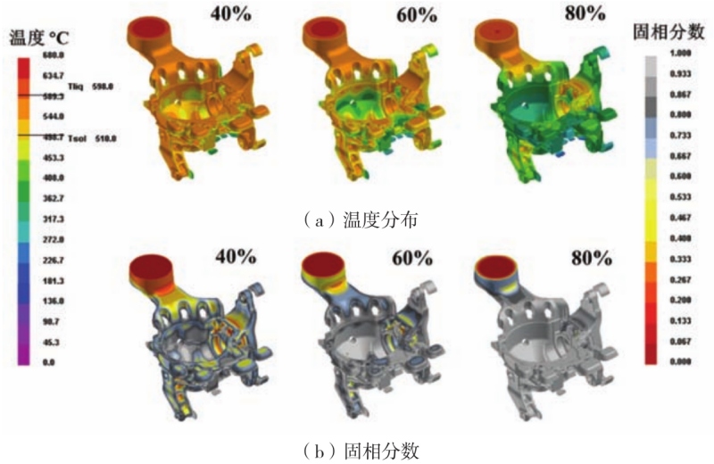 圖4 充型過程時間和溫度分布 2.2 鑄件凝固過程分析 圖5為鑄件凝固過程的溫度分布和固相分數(shù)變化。從圖5a可以看出,當凝固狀態(tài)達到60%時,鑄件壁薄處溫度下降速度較快,此時處于固液相共存狀態(tài),而鑄件壁厚處溫度下降速度慢,仍處于液相狀態(tài)。當凝固狀態(tài)達到80%,型腔內(nèi)大部分區(qū)域的金屬液溫度均已到達固相線之下,但壁厚區(qū)域的金屬液溫度水平較高,與其周圍區(qū)域保持一個較大的溫度梯度(90 ℃),易發(fā)生熱應(yīng)力集中現(xiàn)象,會導致鑄件壁厚處形成熱裂、縮孔缺陷。