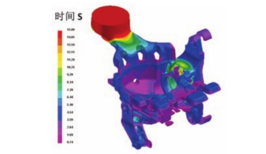 圖5 鑄件凝固過程溫度分布和固相分數(shù) 鑄件凝固過程的固相分數(shù)變化如圖5b所示,鑄件固相分數(shù)分布遵循壁薄區(qū)固相分數(shù)高,壁厚區(qū)固相分數(shù)低的規(guī)律。鑄件右側(cè)上端支架以及壁厚處的固相分數(shù)低于周圍區(qū)域,當周圍區(qū)域的固相分數(shù)達到了0.8時,壁厚區(qū)域的固相分數(shù)僅為0.5,甚至低于內(nèi)澆道的固相分數(shù)。根據(jù)金屬凝固理論,當固相分數(shù)達到一定時,枝晶生長形成封閉骨架,切斷了壓力傳遞和液相補縮通道,這種凝固不均勻現(xiàn)象導致在凝固過程產(chǎn)生孤立液相區(qū),最終在鑄件壁厚處形成縮松、縮孔缺陷。 鑄件凝固時間如圖6所示。由圖可知,鑄件凝固順序遵循由遠及近的規(guī)律。鑄件壁薄區(qū)以及遠澆道處優(yōu)先凝固,溢流槽與鑄件兩側(cè)支架次之凝固,鑄件壁厚區(qū)域最后凝固。這是由于壁薄區(qū)域因溫度較低且與模具熱交換充分,因此會優(yōu)先凝固,而壁厚區(qū)域因壁厚大且傳熱較慢導致其最后凝固。
