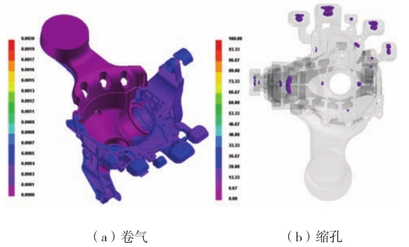 圖6 鑄件凝固時間 2.3 缺陷分析 鑄件內(nèi)部卷氣的分布如圖7a所示。由圖可知,鑄件的溢流槽內(nèi)存在較多氣體,有效地發(fā)揮了排除氣體的作用,證明了溢流系統(tǒng)設(shè)計的合理性。鑄件內(nèi)平均卷氣量約為0.000 3 g/cm³ ,但鑄件右側(cè)支架上端與左側(cè)支架區(qū)域卷氣量約為0.000 6 g/cm³ ,這是由于金屬液在此區(qū)域發(fā)生了卷氣和回流現(xiàn)象,導致該區(qū)域充型不良。