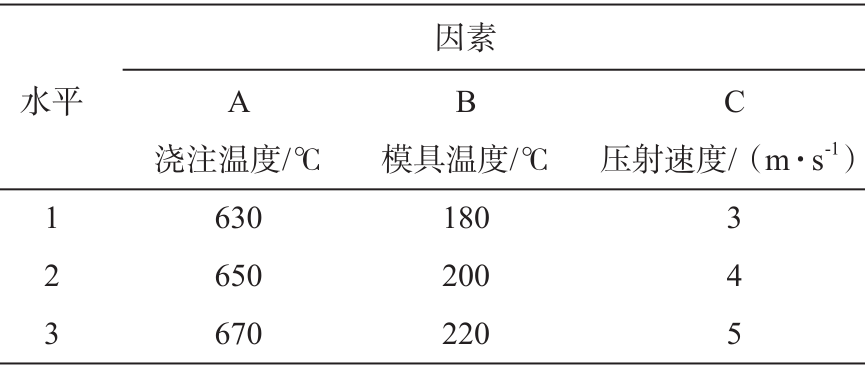 圖7 缺陷預測結(jié)果 鑄件內(nèi)部縮孔的分布如圖7b所示。由圖可知,缺陷分布與對鑄件凝固過程分析一致,鑄件內(nèi)的縮孔大部分集中在壁厚最厚處,少部分在右側(cè)上端支架與底部圓筒處。使用VE軟件對鑄件縮孔體積進行測量,缺陷體積約為3.146 cm³,由于鑄件右側(cè)上端支架與底部圓筒處為零件質(zhì)量要求較高處,不允許內(nèi)部存在縮孔缺陷,因此需要通過優(yōu)化壓鑄工藝來消除縮孔缺陷。 3、壓鑄工藝參數(shù)優(yōu)化 3.1 正交試驗方案設(shè)計 本研究選取澆注溫度、模具溫度、壓射速度作為正交試驗中的主要影響因素,設(shè)計了正交試驗的因素-水平表,如表2所示。