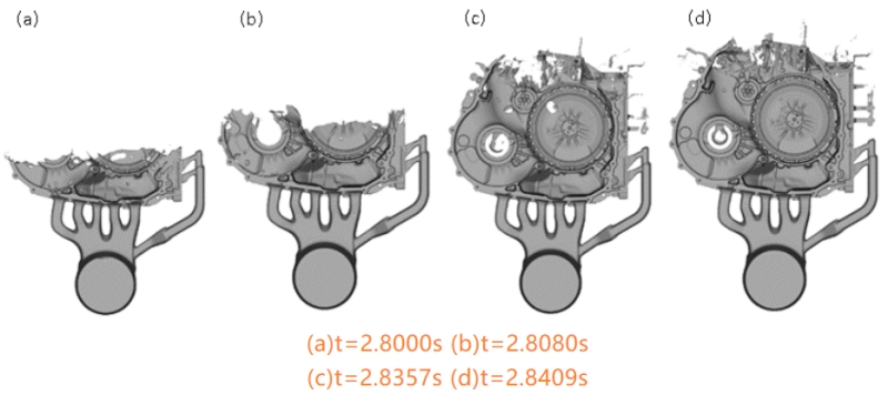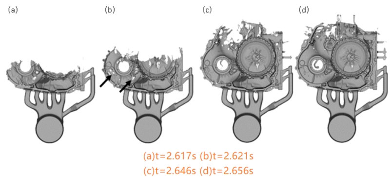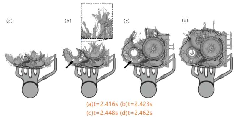 圖5 方案3壓鑄充型模擬結果 圖3為方案1的充型過程??梢钥吹?,由于金屬液進入型腔內并未平穩交匯,而是直接以高速充填型腔,金屬液前端部位出現了十分明顯的噴流(圖3b虛線框),極易產生回流、卷氣現象。左側淺腔箭頭處有很明顯的未填充部分,未來得及排出型腔的氣體被金屬液包裹,造成變速器主殼體內部氣孔缺陷產生。型腔左側部位充型緩慢,卷氣較為嚴重,對壓鑄件的品質影響很大。圖4為方案2的充型過程。可以看出,由于金屬液平穩交匯,當壓射速度從低速轉換為高速時,金屬液能夠平穩地充型。與方案1相比,前端的噴流明顯改善,左側部位的卷氣現象也得到了明顯改善。但是由于左側為淺腔區域,所需填充的金屬液較少,金屬液平穩交匯后開始高速壓射時,金屬液率先進入左側淺腔部分,形成少量噴流,少量氣體被包裹在左側淺腔金屬液中(見圖4b箭頭處)。圖5為方案3的充型過程。從圖5a中可以看出,在高低速切換點進行高低速切換時,金屬液已與右側分支金屬液平穩交匯,當壓射速度從低速轉換為高速時,由于右側分支對右側深腔的充填作用,使得金屬液能夠同時充填左側淺腔區域和右側深腔區域,金屬液以層流的方式進行充型。整個充型過程中產生的噴流很小,且充型較為均勻,左側淺腔部位已無氣體包裹現象。充型過程平穩,有利于將型腔內的氣體排出,從而減少氣孔缺陷產生。