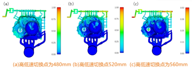 圖2 澆注系統三維圖 通常的壓鑄生產工藝一般取金屬料液到達內澆口的位置為高低速切換點,但由于主殼體形狀復雜,且為箱體結構,常規的高低速切換點并不適用。結合前期工作和大量模擬,高低速切換點取480mm時為金屬液到達內澆口的位置,高低速切換點取520mm時為金屬液從中間5路分支進入型腔且平穩交匯的位置,高低速切換點取560mm時為型腔內金屬液與右側分支金屬料液平穩交匯的位置。因此,為了研究壓射高低速切換點對變速器主殼體充型過程的影響,設計3套模擬方案,高低速切換點分別設置在480、520和560mm處分別為方案1、方案2和方案3。