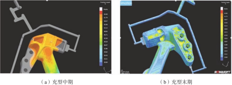 圖4 半固態壓鑄澆注系統、溢流及排氣設計 3.2 數值模擬 使用Sigmasoft Virtual Molding軟件對鋁合金支臂半固態壓鑄充型及凝固過程進行數值模擬,結果如圖5、圖6所示。