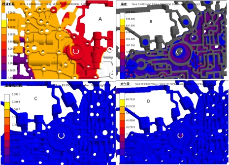 圖二 模流軟件分析視圖 A:料液追蹤;B:溫度;C:折疊氧化物;D:含氣量 02.改善方案及驗證 經過上述缺陷形成機理分析,當前產品結構已無法實施優化。本著改善對策由易到難的解決思路,首先從工藝上嘗試改善,逐步調整軸承孔厚大部位模溫,使軸承孔缺陷區凝固順序發生變化,實現缺陷轉移,機加不暴露缺陷(產品內部缺陷存在,但不影響產品性能)。由此,針對軸承孔厚大區域進行四次溫度調整,并在其它工藝條件不變的條件下開展以下實驗: 1.關閉軸承孔點冷并減少噴涂量,使其溫度處于220℃-240℃之間; 2.關閉軸承孔點冷并增加噴涂量,使其溫度處于190℃-210℃之間; 3.啟用軸承孔點冷,通過增加點冷通水時間,使其溫度處于150℃-170℃之間; 4.軸承孔冷卻水改為長通,溫度處于90-110之間;見“圖三”