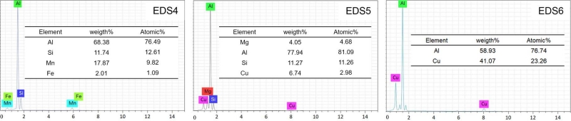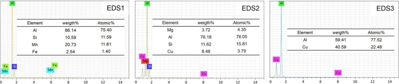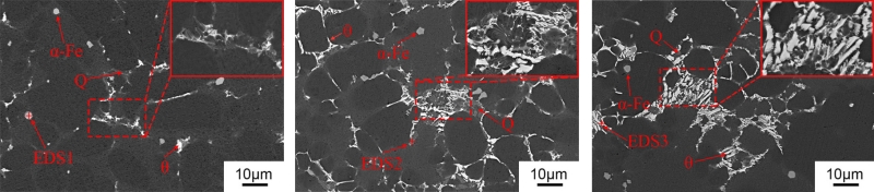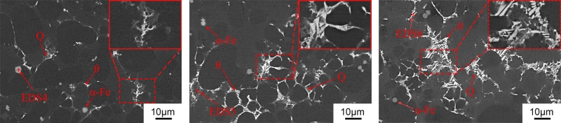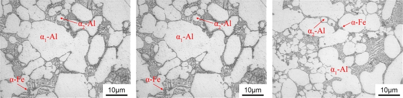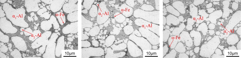 (a)1號(hào) (b)2號(hào) (c)3號(hào) 可以看出,3組合金的鑄態(tài)組織主要由α-Al及Al-Si共晶相組成。其中α-Al晶粒有兩種類型,分別標(biāo)記為α1-Al和α2-Al。這是因?yàn)閴鸿T凝固過程是一個(gè)兩階段過程,當(dāng)熔化后的鋁液倒入壓室,壓室內(nèi)相對(duì)較低的溫度能夠?qū)X液冷卻至液相線溫度以下,此時(shí)α1-Al晶粒在壓室中開始形核并生長(zhǎng),因此也被稱為壓室預(yù)結(jié)晶。這些晶粒伴隨著未凝固鋁液一同進(jìn)入模具型腔,因?yàn)橛谐渥銜r(shí)間長(zhǎng)大,造成最終尺寸較粗大。在模具型腔填充過程中,由于冷卻速率非常快,因此形成了更細(xì)小、形狀也更為圓整的α2-Al晶粒。經(jīng)Sr元素變質(zhì)后的共晶Si呈纖維狀,同時(shí)在共晶區(qū)存在呈現(xiàn)出多邊形的富Fe相,通過EDS能譜分析確認(rèn)其為α-Fe相。