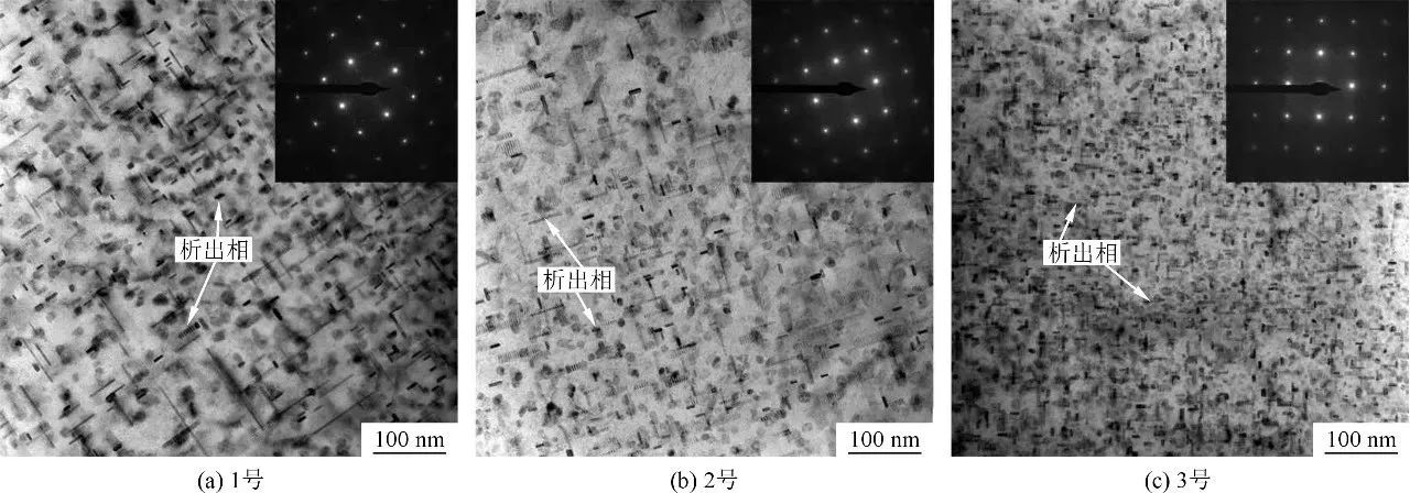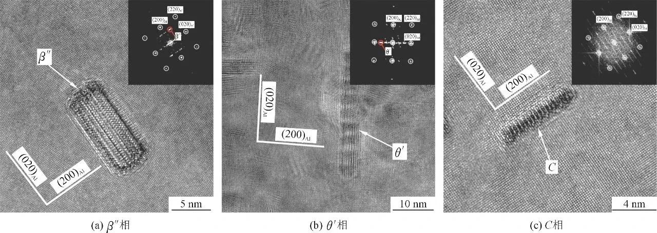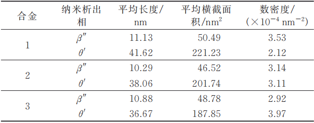 表4 高真空壓鑄Al-10Si-0.5Mn-0.4Mg-xCu合金T5態(tài)析出相統(tǒng)計(jì)結(jié)果 結(jié)論 (1)AlSi10CuMgMn合金的鑄態(tài)組織均由α-Al、共晶Si和α-Fe、Q和θ相組成。隨著Cu含量增加,Q相數(shù)量基本保持不變,形貌以層片狀為主;θ相數(shù)量則逐漸增多,形貌由分散的粒狀轉(zhuǎn)變成聚集的塊狀。 (2)T5熱處理對(duì)鑄態(tài)α-Al、共晶Si、α-Fe、Q和θ相的影響很小。峰值時(shí)效主要納米析出相為β″和θ′相,Cu含量較低時(shí),析出相以β″為主;Cu含量較高時(shí),析出相以θ′為主。