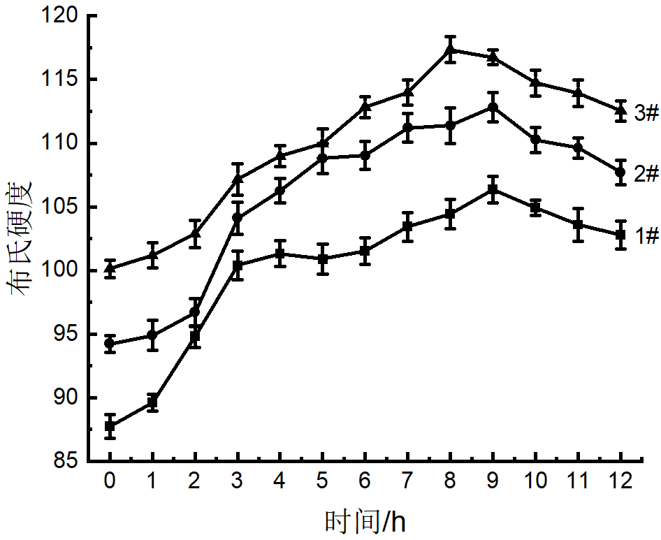 圖5 高真空壓鑄Al-10Si-0.5Mn-0.4Mg-xCu合金平均硬度與時(shí)效時(shí)間曲線 圖6為Al-10Si-0.5Mn-0.4Mg-xCu合金T5熱處理后的金相組織。可以看出,3組合金的T5態(tài)金相組織依然由α-Al、Al-Si共晶區(qū)及α-Fe組成,與鑄態(tài)合金相比,α-Al、共晶Si相和α-Fe相的形貌沒有發(fā)生明顯變化。圖7為合金經(jīng)T5熱處理后的背散射SEM圖片。依舊能觀察到深灰色、淺灰色以及亮白色的金屬間化合物,相應(yīng)的EDS分析結(jié)果顯示,金屬間化合物仍為α-Fe、Q和θ相,形貌沒有發(fā)生變化。表3為峰值時(shí)效時(shí)1~3號(hào)合金中α-Fe、Q和θ相的面積分?jǐn)?shù),可以看出,α-Fe相分別為1.13%、1.09%和1.11%,Q相分別為0.89%、0.82%和0.86%,θ相分別為0.74%、1.66%和2.64%,與鑄態(tài)合金結(jié)果相比,金屬間化合物面積分?jǐn)?shù)沒有發(fā)生明顯變化,表明T5熱處理不會(huì)改變相類型和數(shù)量。