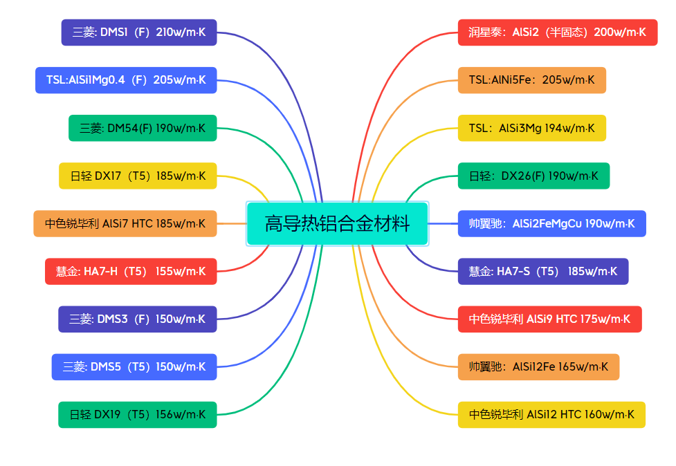 圖3 導(dǎo)熱壓鑄鋁合金代表零件 導(dǎo)熱領(lǐng)域適用鋁合金材料見表4,和ADC12合金相比,為了保證熱導(dǎo)率,要去除雜質(zhì)合金元素,特別是對熱導(dǎo)率影響比較大的元素,如Ti、Mn、Zr、Mg等,各元素對熱導(dǎo)率的影響見圖4。另外,T5熱處理(200~350℃)可以消除壓鑄過程中產(chǎn)生的內(nèi)應(yīng)力,提高材料的熱導(dǎo)率(見圖5)。圖6為高導(dǎo)熱壓鑄鋁合金材料統(tǒng)計??梢钥闯?,合金元素含量越低,熱導(dǎo)率越高,為了獲得200W/(m·K)左右的熱導(dǎo)率,Si的含量通常在2%左右,或者使用Ni元素作為主要合金元素,或者用半固態(tài)工藝。