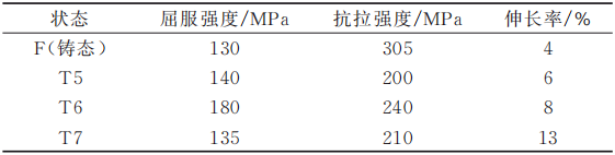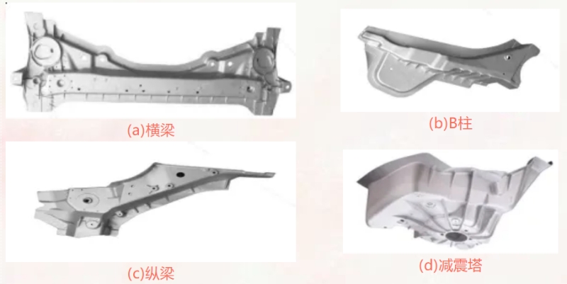 圖6 高導(dǎo)熱壓鑄鋁合金統(tǒng)計 傳動汽車結(jié)構(gòu)件主要有橫梁、B柱、縱梁、減震塔等,見圖7。根據(jù)車身鏈接安全和鏈接的要求,這類產(chǎn)品通常需要更高的伸長率,一般要求12%以上;對應(yīng)的壓鑄鋁合金材料主要為萊茵鋁業(yè)形發(fā)的Silafont-36(AlSi10MnMg),其不同狀態(tài)下性能見表5,在EN1706對應(yīng)牌號為ENAC 43500,該合金用Mn替代Fe元素,解決壓鑄粘模的問題,同時,Mn元素對合金的伸長率副作用不明顯。經(jīng)過T7熱處理后,最終伸長率達(dá)到12%以上。但是由于T7熱處理的溫度為450~480℃,壓鑄內(nèi)部的微小氣孔膨脹,產(chǎn)生氣泡,同時,固溶過程高溫到低溫過程造成產(chǎn)品變形,給產(chǎn)品的外觀輪廓及尺寸帶來困擾,造成成本大幅度增加。