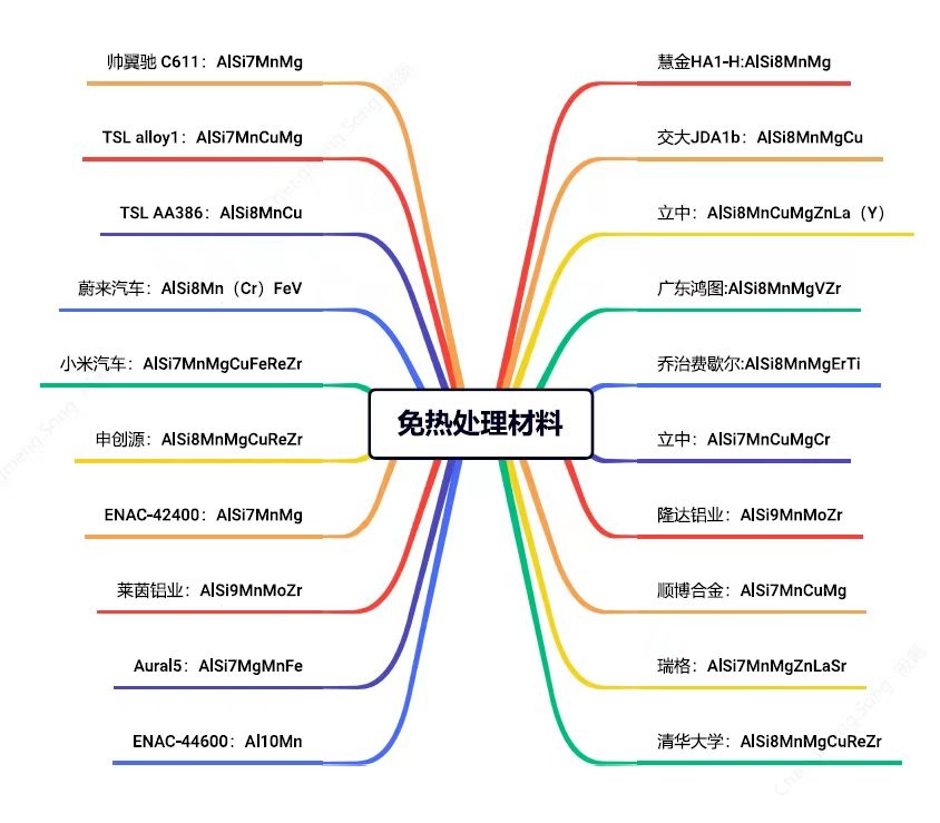 表5 Silafont-36(AlSi10MnMg)不同狀態(tài)下的性能 根據(jù)國海證券的調(diào)研報告,2022年特斯拉Model Y的后底板和前機艙高度集成,零件數(shù)量從171個零件縮減為2個(圖8),焊接點位可以減少1600多個。由于這類產(chǎn)品的尺寸比較大,在熱處理過程中容易變形,尺寸得不到很好保證。因此,一體式大型壓鑄件無法通過熱處理調(diào)節(jié)性能,Silafont-36(AlSi10MnMg)無法在這類產(chǎn)品中應(yīng)用。為了解決這個問題,新型免熱處理材料的研發(fā)已迫在眉睫;材料成為發(fā)展一體式壓鑄的基礎(chǔ)。目前,整車廠蔚來、小米等都在布局材料方面的專利,零部件壓鑄企業(yè),如文燦、鴻圖等,原材料提供商,如帥翼馳、申源創(chuàng)、中鋁國際、日輕金屬、蘇州慧金等有相應(yīng)的專利儲備,高校,如清華大學(xué),上海交通大學(xué)等都在積極參與(見圖9)。