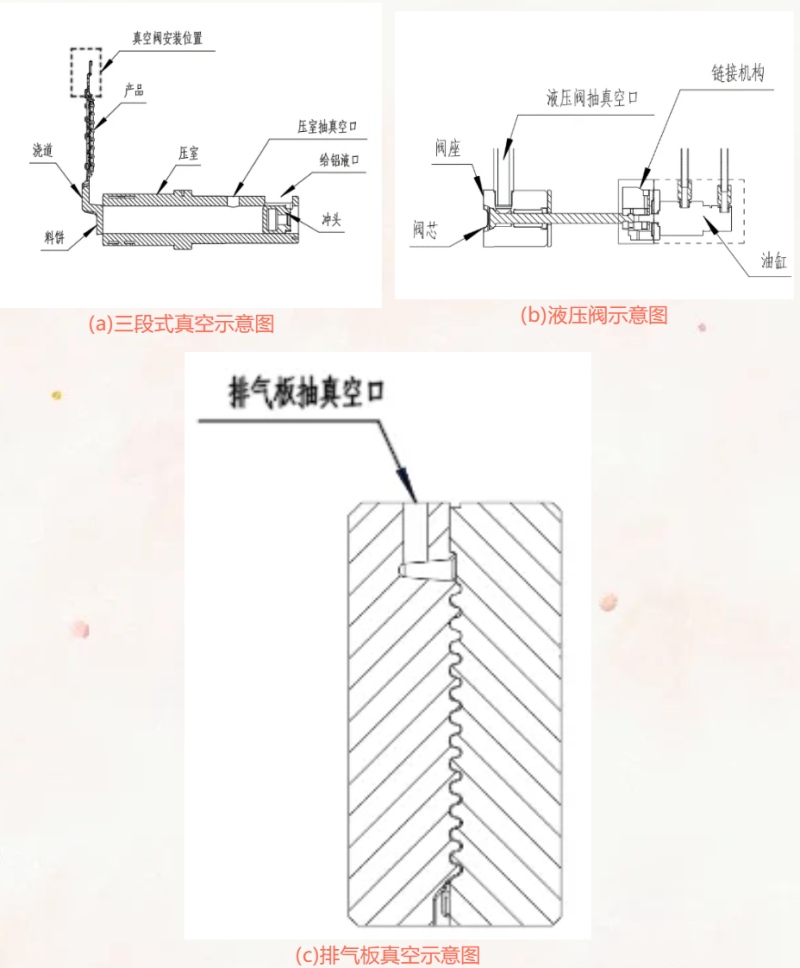 圖10 免熱處理材料合金元素分析 免熱處理合金中Si含量在6%~9%之間,從相圖中可以看出,Si含量越低,液相線的溫度越高,造成鋁液的流動性下降。其次,由于Si含量降低,液相線溫度和固相線溫度的溫度差拉大,壓鑄產(chǎn)品在凝固過程中產(chǎn)生縮孔的概率也大幅度提升,工藝難度大大提高;此外,Si含量降低,凝固收縮率變大,造成脫模阻力加大,給脫模及尺寸控制帶來困難。為了解決這些問題,采用三段式抽真空技術(shù),見圖11,既保證了產(chǎn)品遠(yuǎn)端的成形,同時又保證了伸長率。三段式抽真空的原理為,當(dāng)沖頭剛過鋁液口時,壓室真空通道、液壓閥真空通道、排氣板真空通道全部打開,開始抽真空。此時,沖頭移動速度處于低速階段,一般速度控制在0.15~0.3 m/s之間;當(dāng)沖頭到壓室抽真空點后,壓室抽真空通道關(guān)閉;沖頭繼續(xù)向前移動,當(dāng)啟動高速速度位置前100mm位置,見圖12。為了避免液壓真空閥堵塞,關(guān)閉液壓閥,進(jìn)入高速充填階段。當(dāng)壓射結(jié)束時,排氣板真空通道關(guān)閉。三段式真空過程,壓室真空和液壓閥真空的通道的優(yōu)點在于截面積大,可以在短時間內(nèi)將模具內(nèi)的真空度降低。但是壓射開始時,模具間隙位置(如推桿間隙),會有空氣進(jìn)入,此時,排氣板真空通道一直打開,有效平衡了模具漏氣,讓整個壓射過程都處于比較高的真空度下,通常真空度在5kPa以內(nèi)。