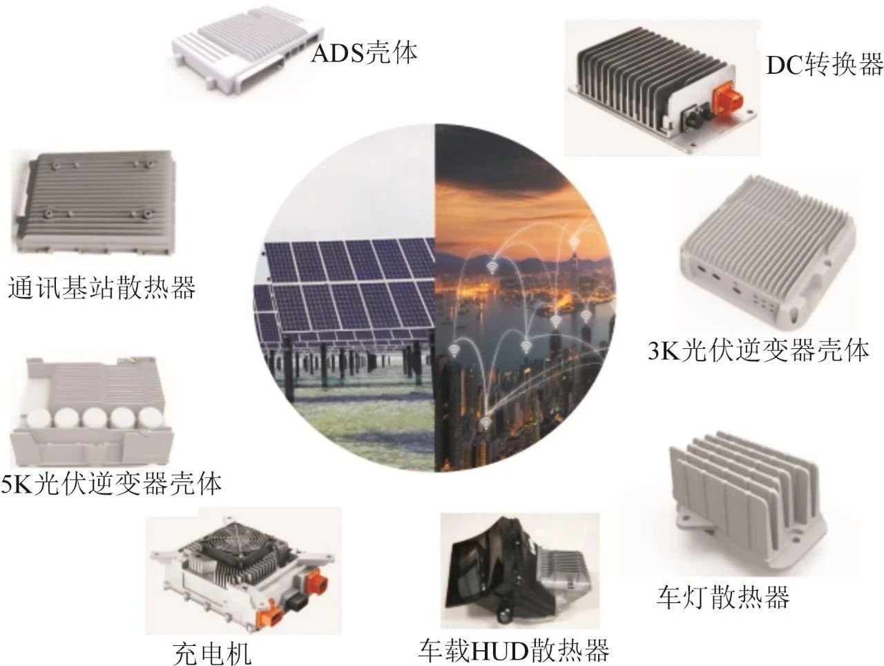 表3 中國壓鑄鋁合金化學(xué)成分(%) 可以看出,各種標(biāo)準(zhǔn)的鋁合金材料成分具有相似性,可以根據(jù)使用要求選擇合金材料。常規(guī)的壓鑄鋁合金,對伸長率、熱導(dǎo)率沒有特殊的要求,主要用于汽車、摩托車發(fā)動機零部件,如發(fā)動機覆蓋件、油底殼、缸體、變速器殼體等。 隨著5G技術(shù)的發(fā)展,通訊基站用壓鑄鋁合金越來越多(見圖1),主要用于生產(chǎn)散熱器殼體。由于傳統(tǒng)的ADC12鋁合金的熱導(dǎo)率只有100W/(m·K),壓鑄材料一般選擇ENAC44300,以提高零件的熱導(dǎo)率;此外,可采用200~350℃的T5熱處理。除了5G通信領(lǐng)域之外,光伏行業(yè)也對壓鑄鋁合金的需求越來越大,代表零部件為逆變器殼體,見圖2。“光伏+儲能”已成為多國光伏開發(fā)的標(biāo)準(zhǔn)配置。在搭配儲能以后,將為光伏帶來長期、可持續(xù)的發(fā)展動力。預(yù)計2025年全球光伏新增裝機370GW,屆時儲能逆變器的新增需求約為74GW。專家預(yù)測,到2025年,世界能量供給來源中的2%來自于光伏發(fā)電,到2055年,光伏發(fā)電將會輸送更多的能量,約占總能源供給的25%,到2150年將超過50%。這類鋁合金除了對導(dǎo)熱有需求之外,為了應(yīng)對意外爆炸不產(chǎn)生碎片,對伸長率也有一定的要求,通常要求在5%以上。散熱領(lǐng)域主要的零部件見圖3。主要包含ADS殼體、DC轉(zhuǎn)換器、基站散熱器、光伏逆變器、充電機、車載散熱器和車燈散熱器等。