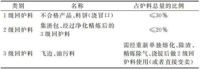表4 回爐料分級管控參照表 鋁合金在壓鑄生產(chǎn)過程中, 由于需要對壓射沖頭進行潤滑, 潤滑介質(zhì)為沖頭潤滑油或者潤滑顆粒。壓鑄完成后, 大部分的沖頭潤滑殘留物積聚在料餅表面, 形成夾雜物。在回爐料中有一部分是加工后的廢品, 其表面含有切屑液及油污的殘留成分, 熔化過程中, 殘留的切屑液和油污經(jīng)過高溫加熱, 產(chǎn)生大量的煙氣、水氣, 加速了Al液的吸氣以及氧化夾雜產(chǎn)生。為保證Al液品質(zhì), 建議回爐料占比見表4。根據(jù)以上試驗數(shù)據(jù)分析, 回爐料不僅導致Al液中夾雜物增多以及化學成分變化, 而且由于夾雜物增多, 也會影響鑄件的力學性能;在壓鑄充填過程中還會影響Al液的流動性, 導致諸多壓鑄缺陷產(chǎn)生。所以在日常熔化過程中, 既要考慮到熔煉成本, 又要保證Al液的質(zhì)量, 根據(jù)產(chǎn)品需求必須對回爐料進行分級并合理按所需比例使用。