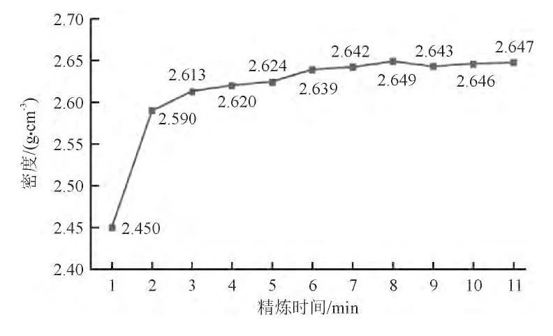 圖2 精煉除氣時間與鋁合金試樣密度的關系圖