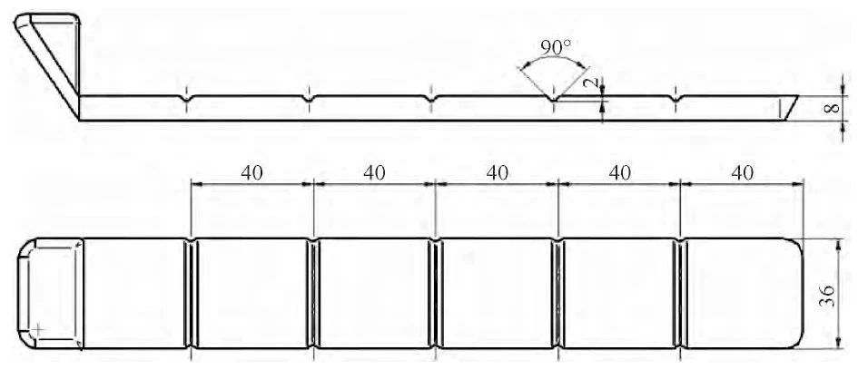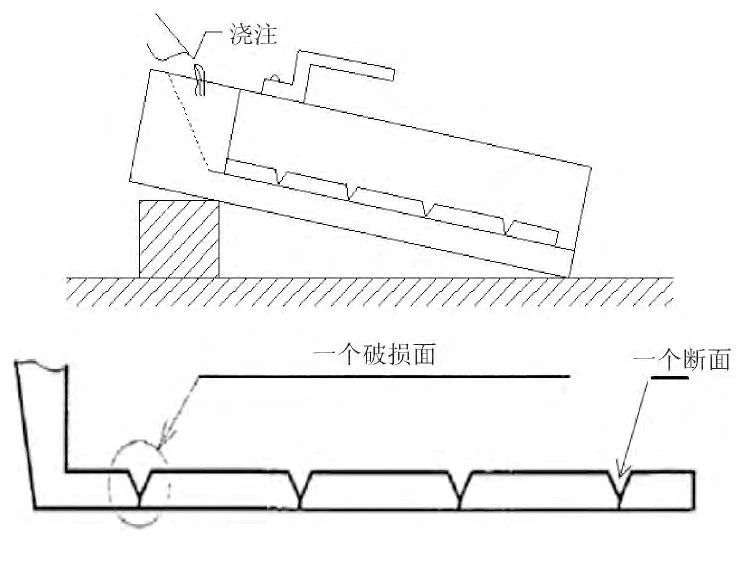 圖5 K模尺寸示例圖 (1) K模模具準備K模清潔1次/班, 并均勻噴涂模劑涂料打底;K模預熱30~60min;其底面與地面末端夾角為30°~45°, 方便Al液導入、氣體排出。(2) K模尺寸 (見圖5) 及試樣澆注:①用勺子舀Al液, 勺子倒入K模時不得澆注過快以免堵塞澆料口, 導致K模內(nèi)氣體無法從澆料口排出, 保持勻速直至澆滿; ②待冷卻8~10s將K模試樣取出, 按照此方式連續(xù)澆注5模試樣; ③K模澆注前:Al液必須經(jīng)過旋轉除氣機除渣除氣完成后進行, 澆包內(nèi)浮渣清理干凈; ④等待K模試樣自然冷卻或者水冷后擦干試樣表面殘留水分, 將每根K模試樣按照折斷線位置均勻敲成4小段, 并整齊碼放一起, 共計5組。