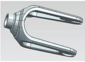 電動滑板車比傳統(tǒng)電動自行車結(jié)構(gòu)簡單、車輪小、輕巧簡便,能節(jié)省大量社會資源。是現(xiàn)代人用來作為代步工具、休閑娛樂的一種新型的綠色環(huán)保的產(chǎn)物。前叉部件在電動車結(jié)構(gòu)中處于前方部位,它的上端與車把部件相連接,車架部件與前管配合,下端與前軸部件配合,組成電動車的導(dǎo)向系統(tǒng)。由于位置的特殊性,因此對前叉零件的質(zhì)量要求比較高,特別是其強(qiáng)度。目前主要采用金屬型重力鑄造或鍛造方法,重力鑄造電動車前叉零件致密性和強(qiáng)度不高,生產(chǎn)效率較低,而采用鍛件性能好,但是機(jī)械加工量大,成本高。結(jié)構(gòu)件的壓鑄生產(chǎn)多采用半固態(tài)或真空壓鑄,這都會為壓鑄生產(chǎn)過程增加工序,工藝更加復(fù)雜,生產(chǎn)成本增加。為此,本文通過采用低含氣量壓鑄工藝為某高端電動滑板車生產(chǎn)企業(yè)開發(fā)前叉壓鑄件,基于智鑄超云壓鑄CAE云計算平臺進(jìn)行壓鑄工藝的模擬仿真,通過模擬分析可預(yù)測卷氣、縮松、縮孔等缺陷,并進(jìn)行工藝的優(yōu)化,從而可有效避免壓鑄缺陷的產(chǎn)生,縮短開發(fā)周期,提高鑄件品質(zhì),降低成本,為該類鑄件的壓鑄生產(chǎn)提供參考。 1 壓鑄件分析及工藝設(shè)計 1.1 前叉壓鑄件分析 該鑄件是某公司生產(chǎn)的電動滑板車前叉三維實(shí)體,如圖1所示。最大外形尺寸為197 mm×103 mm×76 mm,毛坯重520 g,其結(jié)構(gòu)適中,但壁厚不均,薄壁處約為4.5 mm,厚壁部位超過12 mm,平均壁厚約為7 mm。壓鑄件要求沒有氣孔,能進(jìn)行T6處理,需通過滾筒測試疲勞沖擊20萬次,要求不會產(chǎn)生裂紋、變形和斷裂。合金材料選擇A380,化學(xué)成分如表1所示。