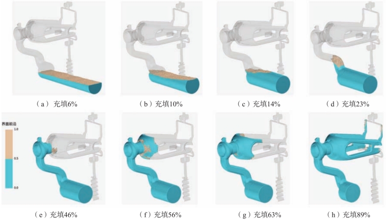 圖4 高速位置1充填過程模擬結(jié)果 為了消除前叉鑄件圓柱孔末端位置的卷氣,考慮將起高速位置往前移,如圖3b和c所示。高速位置往前移后的充型過程卷氣壓力分布的模擬結(jié)果如圖5所示。