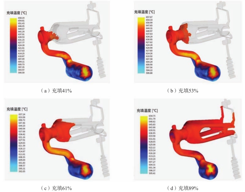 圖5 充填過程卷氣壓力分布圖 從圖中可以看出,當(dāng)起高速前移到位置2時,在前叉鑄件圓柱孔末端位置的卷氣壓力有所改善,但是還沒有完全消除,如圖5b所示;當(dāng)起高速前移到位置3時,在前叉鑄件圓柱孔末端位置的卷氣壓力基本消除,如圖5b所示。從圖6所示高速位置3充填過程的溫度分布圖可以看出,合金液進(jìn)入型腔后,流動平穩(wěn),由于高速位置前移到了零件型腔中,避免了在鑄件圓柱孔末端位置產(chǎn)生大的噴射流,從而可消除該處的卷氣現(xiàn)象。