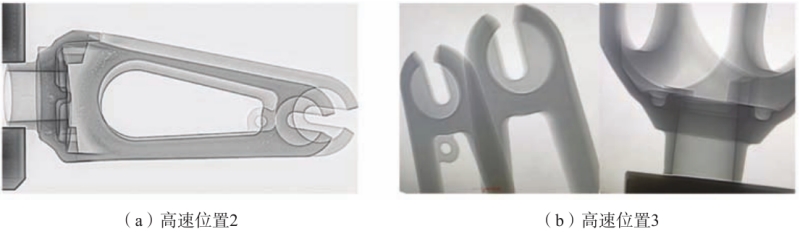 圖6 高速位置3充填過程模擬結(jié)果 另外,高速位置前移會延長充型的時間,增加形成冷隔、澆不足等缺陷的風(fēng)險。但是,從其溫度分布圖可以看到,最后充填完型腔后合金液還具有較高的溫度,基本上都在620 ℃,高于A380鋁合金的液相線溫度(599 ℃),低溫的合金液基本上都留在了料筒中,沒有進(jìn)入型腔。 3 生產(chǎn)實(shí)踐 為了進(jìn)行驗(yàn)證模擬優(yōu)化方案的可行性,采用該壓鑄工藝開發(fā)了壓鑄模具進(jìn)行實(shí)際生產(chǎn),具體壓射工藝為:鋁熔體出爐溫度為660 ℃,低速壓射采用勻加速壓射工藝,其最高臨界速度為0.57 m/s,高速速度為4 m/s,模具溫度控制在200 ℃左右。分別采用高速位置2和3進(jìn)行了生產(chǎn)實(shí)踐驗(yàn)證,都獲得了外形輪廓清晰、表面光滑、尺寸精度高的前叉壓鑄件,前叉壓鑄件的實(shí)物圖如圖7所示。通過對鑄件整體的X光透射探傷發(fā)現(xiàn),采用高速位置2進(jìn)行生產(chǎn)的前叉壓鑄件在靠近圓柱孔末端位置存在較多的孔洞,如圖8a所示。采用阿基米德法獲得鑄件的密度為2.718 g/cm³,孔隙率為8.09‰。而采用高速位置3所生產(chǎn)的鑄件內(nèi)部沒有發(fā)現(xiàn)孔洞,如圖8b所示,將鑄件從中間剖開后也沒有發(fā)現(xiàn)縮松、縮孔、氣孔和氧化夾雜等缺陷,剖切面沒有發(fā)現(xiàn)孔洞,組織致密,如圖7b所示。鑄件的密度達(dá)到2.739 g/cm³,孔隙率僅為0.39‰。由此可見,壓鑄件的孔隙率遠(yuǎn)小于2%的壓鑄件標(biāo)準(zhǔn),同時也說明壓鑄件的含氣量很低。